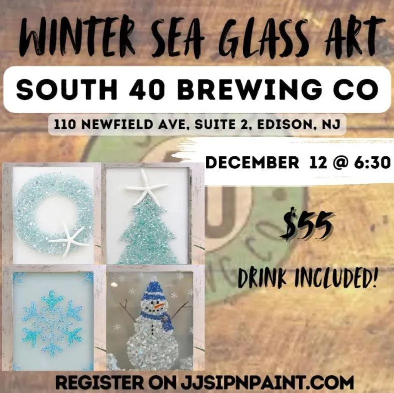 JJ Sip & Paint is back for another sea glass class! This on is winter themed! Sign up at jjsip&paint.com! Your fee includes your first pour.